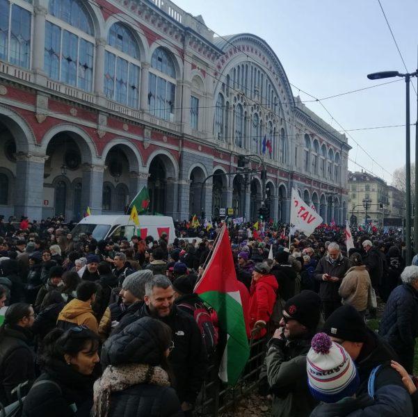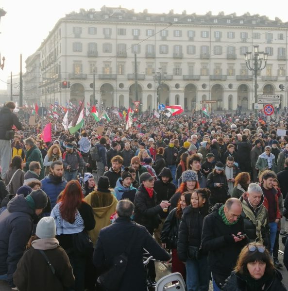 Giunti a Porta Nuova il senso d’inadeguatezza improvvisamente sparisce. Siamo tanti, tantissimi e questo mi dà forza, coraggio e mi rassicura. Non spareranno a tutta questa gente in corteo, penso. Ci sono bandiere palestinesi, bandiere NO TAV, bandiere antifa; giovani, anziani, qualche genitore col passeggino. Provo a salire sopra uno dei corrimani della fermata del bus per fare qualche foto, ma la voce dell’altoparlante in testa al corteo annuncia che stanno per arrivare quelli che si sono dati appuntamento a Porta Susa e che a breve si ricongiungeranno con questa parte della manifestazione, per cui si può partire. Alle 15 il corteo avanza. In men che non si dica raggiungiamo Lungo Po e la voce al megafono annuncia «Siamo 50mila!». Voglio verificare cosa dicono i giornali: apro sul cellulare La Stampa e leggo “20mila manifestanti a Torino”. Decido che la verità sta nel mezzo e che siamo circa 35mila. Mentre camminiamo un elicottero della polizia ci sorveglia dall’alto, ma non è il solo: vedo numerosi droni in cielo, anche se non riesco a capire se appartengano alla Digos, a qualche giornalista o a qualche appassionato di modellismo. In corteo mi confronto con amici e amiche e imparo cose nuove. Uno di questi mi racconta di essere stato tanti anni fa a Napoli ed essere stato al centro sociale “Je So’ Pazzo”. «Dovresti vederlo, è bellissimo» mi dice e aggiunge «la cosa incredibile è che è talmente grosso che in un’ala dell’edificio puoi fare un concerto senza disturbare quelli che stanno nella zona biblioteca. Hanno anche una piccola farmacia e un ambulatorio popolare». «Tra l’altro» aggiunge «il comune di Napoli l’ha dichiarato “bene comune”». Immediatamente penso ad Askatasuna e al “patto di collaborazione” che per un momento c’è stato con il Comune di Torino, prima che il sindaco Lo Russo lo stracciasse in nome della legalità. Un’altra amica in corteo mi racconta: «all’epoca dell’università studiavo nelle aule studio dell’ex Caserma di via Asti. Poi venne sgombrata e da allora è rimasta uno spazio chiuso. Stessa sorte alla Cavallerizza Reale. Facevano un sacco di concerti e di eventi a prezzi accessibili a tutti e dopo lo sgombero è passata in mano alla Compagnia di San Paolo, una banca». Mentre ascolto queste parole comincio a prendere consapevolezza del perché sono venuto al corteo e mi viene in mente la poesia “Prima vennero…”. La cerco su internet, perché non me la ricordo a memoria e scopro di aver sempre pensato che fosse di Bertolt Brecht, quando invece è opera del pastore Martin Niemöller. Quante cose si possono imparare partecipando ad una manifestazione. Leggo la poesia: «Prima di tutto vennero a prendere gli zingari, e fui contento, perché rubacchiavano. Poi vennero a prendere gli ebrei, e stetti zitto, perché mi stavano antipatici. Poi vennero a prendere gli omosessuali, e fui sollevato, perché mi erano fastidiosi. Poi vennero a prendere i comunisti, e io non dissi niente, perché non ero comunista. Un giorno vennero a prendere me, e non c’era rimasto nessuno a protestare».