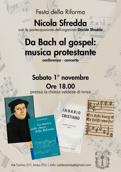 In occasione della Festa della Riforma, la Chiesa Valdese di Ivrea è lieta di invitare la cittadinanza a una conferenza-concerto sulla musica protestante, da Lutero al gospel, con il pianista Nicola Sfredda, musicologo, docente presso il Conservatorio di Mantova e studioso della musica della Riforma, e Davide Sfredda, organista.