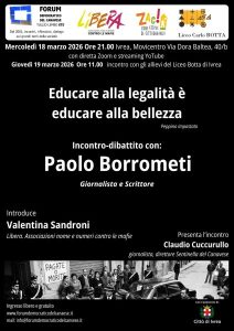 Il Forum Democratico del Canavese, lo ZAC! e Libera, propongono una riflessione profonda su uno dei pilastri della convivenza democratica: il contrasto alla criminalità. Mercoledì 18 marzo alle 21, Movicentro, via Dora Baltea 40/b. Giovedì 19 marzo alle 11 incontro con gli allievi del Liceo Botta.