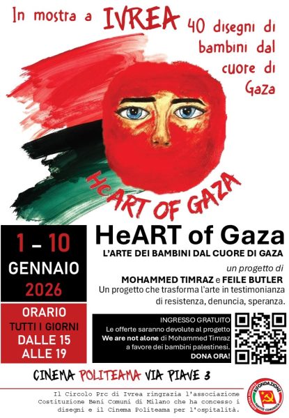 Dal 1 al 10 gennaio, al Cinema Politeama di Ivrea, sarà ospitata una tappa della mostra itinerante “HeART of Gaza”. Non solo un’esposizione artistica, ma un grido di umanità che arriva direttamente dal cuore della Striscia di Gaza, raccontato attraverso gli occhi di chi ne subisce le conseguenze più drammatiche.