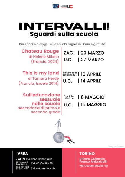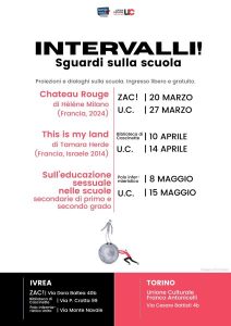 Intervalli! Sguardi sulla scuola è un piccolo ciclo di proiezioni cinematografiche e dibattiti sulla scuola. Il ciclo, curato da Unione Culturale Antonicelli e Associazione Rosse Torri, ha luogo fra Torino e Ivrea e ha l’ambizione di creare piccole comunità di docenti, studenti (e non solo) disposte a guardare film, ragionare sulla scuola, e discuterne
