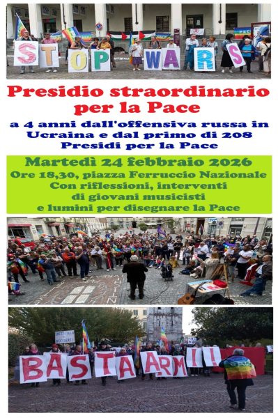 Martedì 24 febbraio alle 18.30 presidio straordinario per la Pace in piazza Ferruccio Nazionale a Ivrea a quattro anni dall’offensiva russa in Ucraina e dal primo di ormai 208 presidi che ogni sabato dal febbraio 2022 si tengono in città per mantenere alta l’attenzione sui conflitti e sulle sorti dei popoli oppressi e per affermare piena contrarietà e preoccupazione per la corsa al riarmo dell’Europa, Italia inclusa, dimenticando il ripudio costituzionale alla guerra.