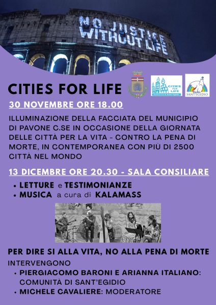 L’amministrazione comunale di Pavone Canavese ha aderito alla Giornata Internazionale “Cities for Life”, illuminando il Municipio il 30 novembre e organizzando un convegno in collaborazione con la Comunità di Sant’Egidio.