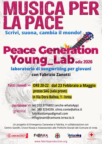 Lunedì 23 febbraio prenderà il via la terza edizione di Musica per la Pace, ribattezzato “Peace Generation”. Un progetto ideato da Emergency Canavese e dall’associazione culturale Fabrika, per promuovere, la pace, la nonviolenza e la condanna della guerra nelle giovani generazioni.