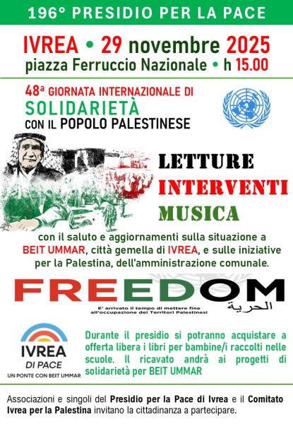 Sabato 29 novembre 2025 la città di Ivrea manifesterà la solidarietà con la Palestina, con un Presidio straordinario in Piazza Ferruccio Nazionale, a partire dalle ore 15, in occasione della “48a Giornata Internazionale di Solidarietà con il Popolo Palestinese”, dichiarata dall’ONU nel 1977.