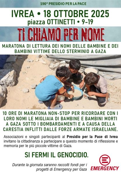 Associazioni e singoli partecipanti al Presidio per la Pace di Ivrea organizzano, come 190° Presidio, una maratona di 10 ore di lettura dei nomi delle bambine e dei bambini morti a Gaza dal 7 ottobre 2023.